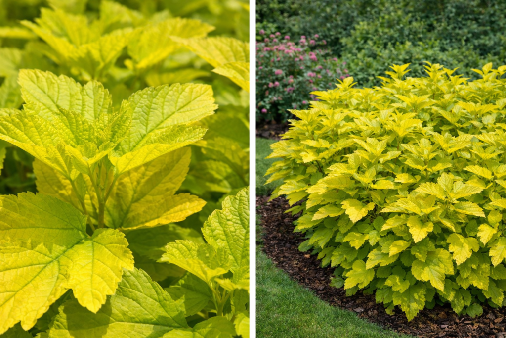 - A hólyangvessző ‘Darts Gold’ a sárga és zöld lombozatával kiemelkedik a kertben, és a rózsaszín virágok csodálatosan kontrasztálnak a levelekkel.