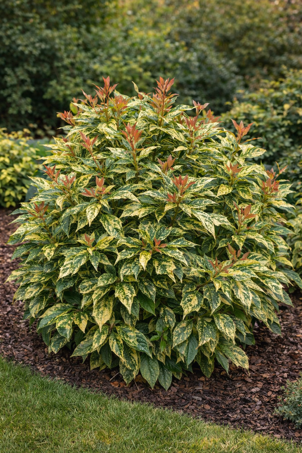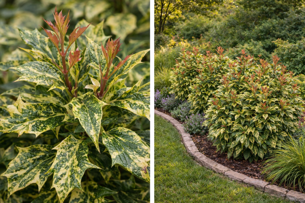 • Lombozat: Fogazott szélű, változatos színű levelek: zöld alapon sárga és krémfehér foltokkal, fiatal hajtásokon bronzos árnyalatokkal.