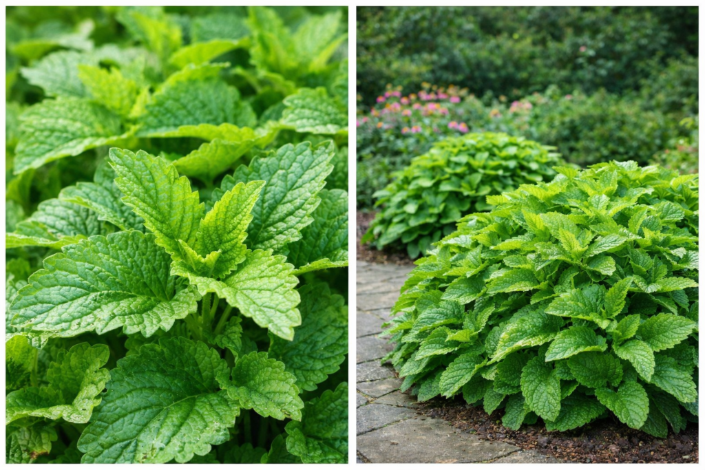 • Levelek: Szív alakú, fogazott szélű, zöld levelek, amelyek erős citromillatot árasztanak.